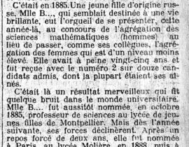 Liouba Bortniker, fut la première femme à obtenir l’agrégation de mathématiques masculine En 1885, lorsque Liouba Bortniker passe l’agrégation, il existe une agrégation réservée aux femmes et une agrégation réservée aux hommes. Après avoir été admissible à la session de 1883, elle arrive, deux ans plus tard, deuxième sur douze admis. Professeur au lycée Fénelon, … Lire la suite de Liouba Bortniker